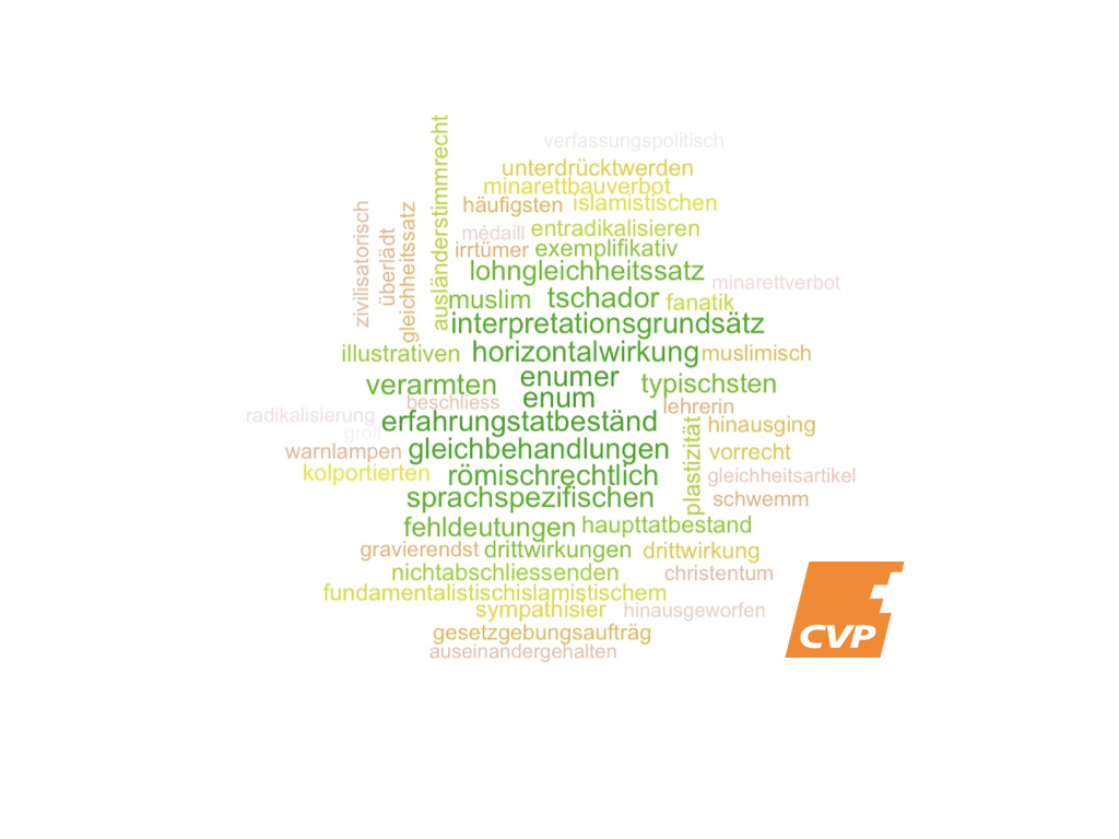Wordclouds: In den Wordclouds ist zu sehen, welche Wörter stark mit dem Term «Islam» in Verbindung gebracht werden. Dazu wurde für jede einzelne der 5 grössten Parteien der Schweiz eine eigene Wordcloud erstellt. Der R-Befehl findAssocs() aus dem Package tm findet aufgrund der einzelnen Texte die Wörter, welche mit dem Islam in Verbindung gebracht werden. Die Grösse dieser Wörter entspricht dem Wert, wie stark die Wörter assoziiert werden.