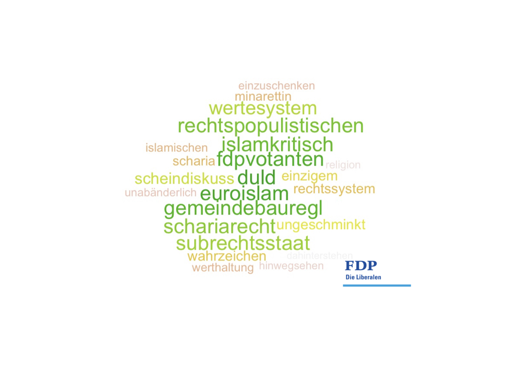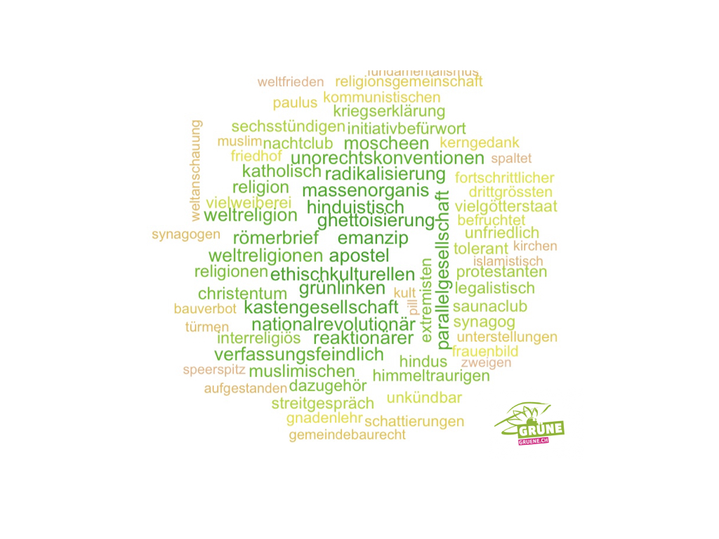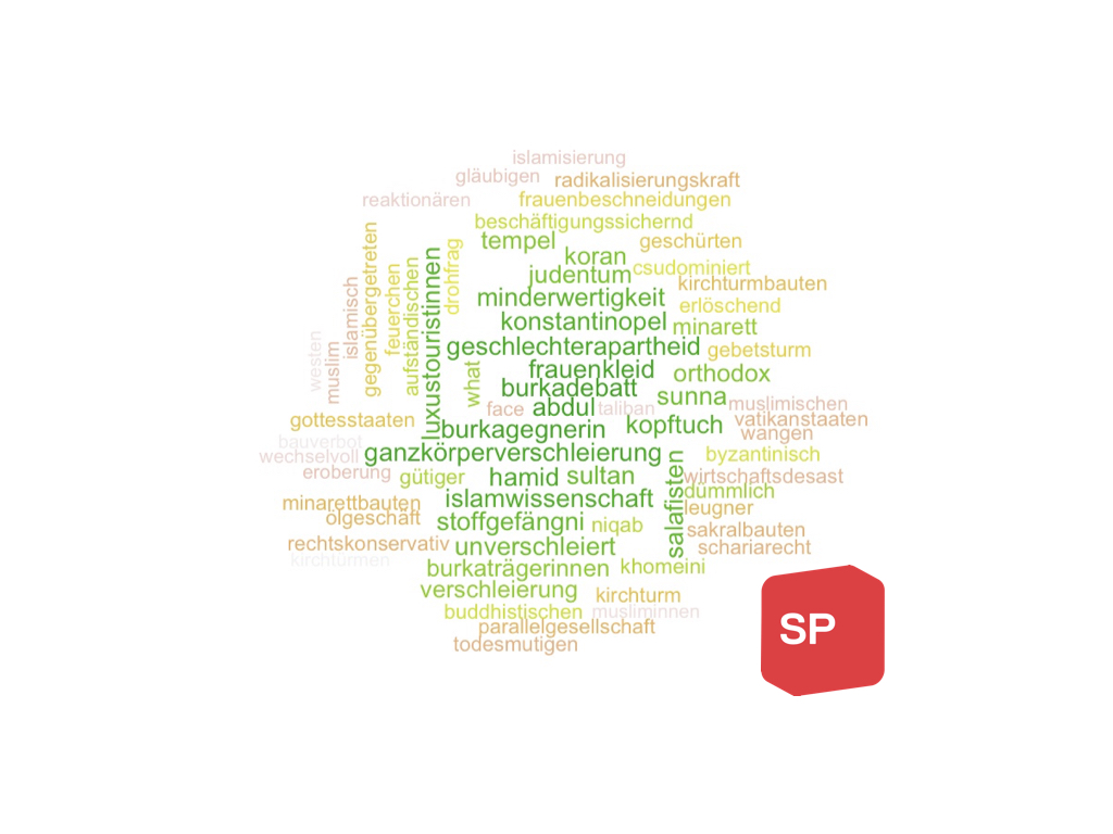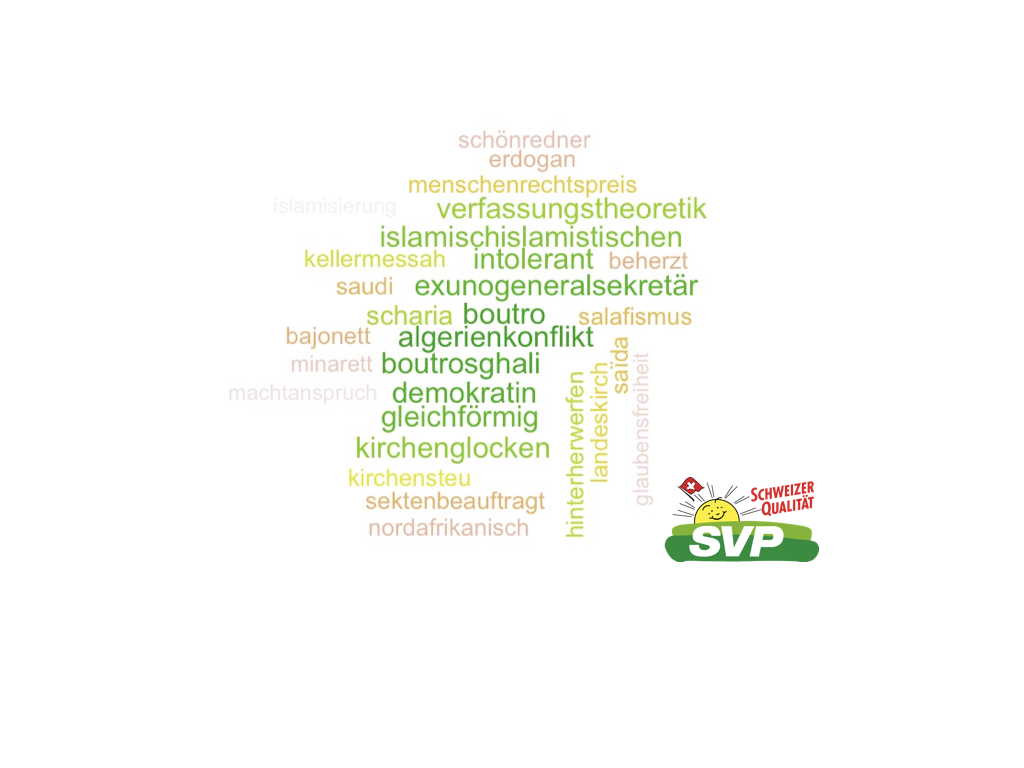 Mit dem Aufkommen rechtspopulistischer Parteien und verstärkter Islamfeindlichkeit in Westeuropa werden Moslems als ethnische und religiöse Aussenseiter stigmatisiert. Nicht selten wird auch hierzulande die muslimische Minderheit als Problem betrachtet. Gewisse Politiker garantieren den Wählern, dass sie gewillt sind konsequent mit dem Problem «Islam» umzugehen und andere plädieren auf das multikulturelle Zusammenleben ohne auf die Ängste der Bevölkerung einzugehen. In welche Gruppe lassen sich die Schweizer Parteien einordnen? Anhand der aus den Parlamentsreden generierten Wordclouds kann herausgelesen werden, mit welchen Begriffen die Parteien den Islam assoziieren. Je grösser die Wörter im Wordcloud abgebildet sind, desto stärker assoziiert die Partei diese mit dem Islam.